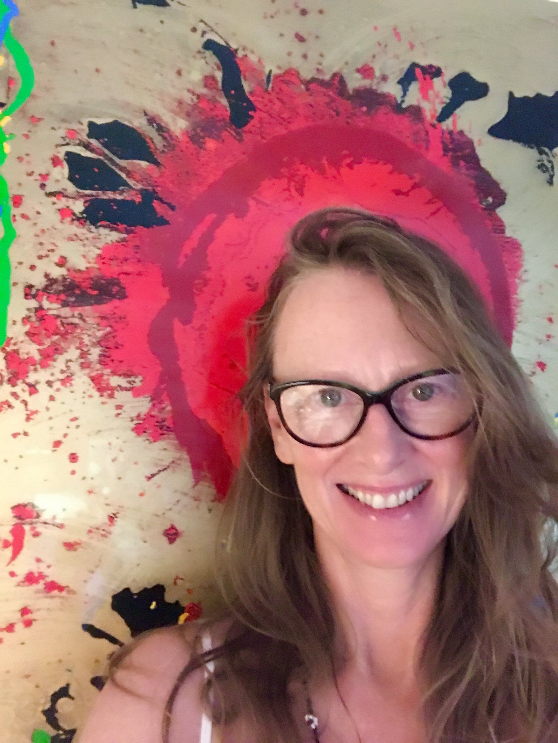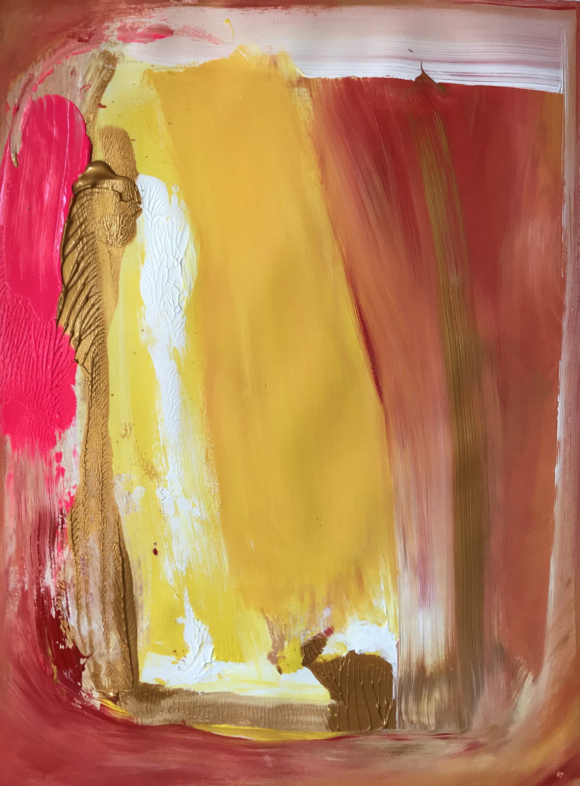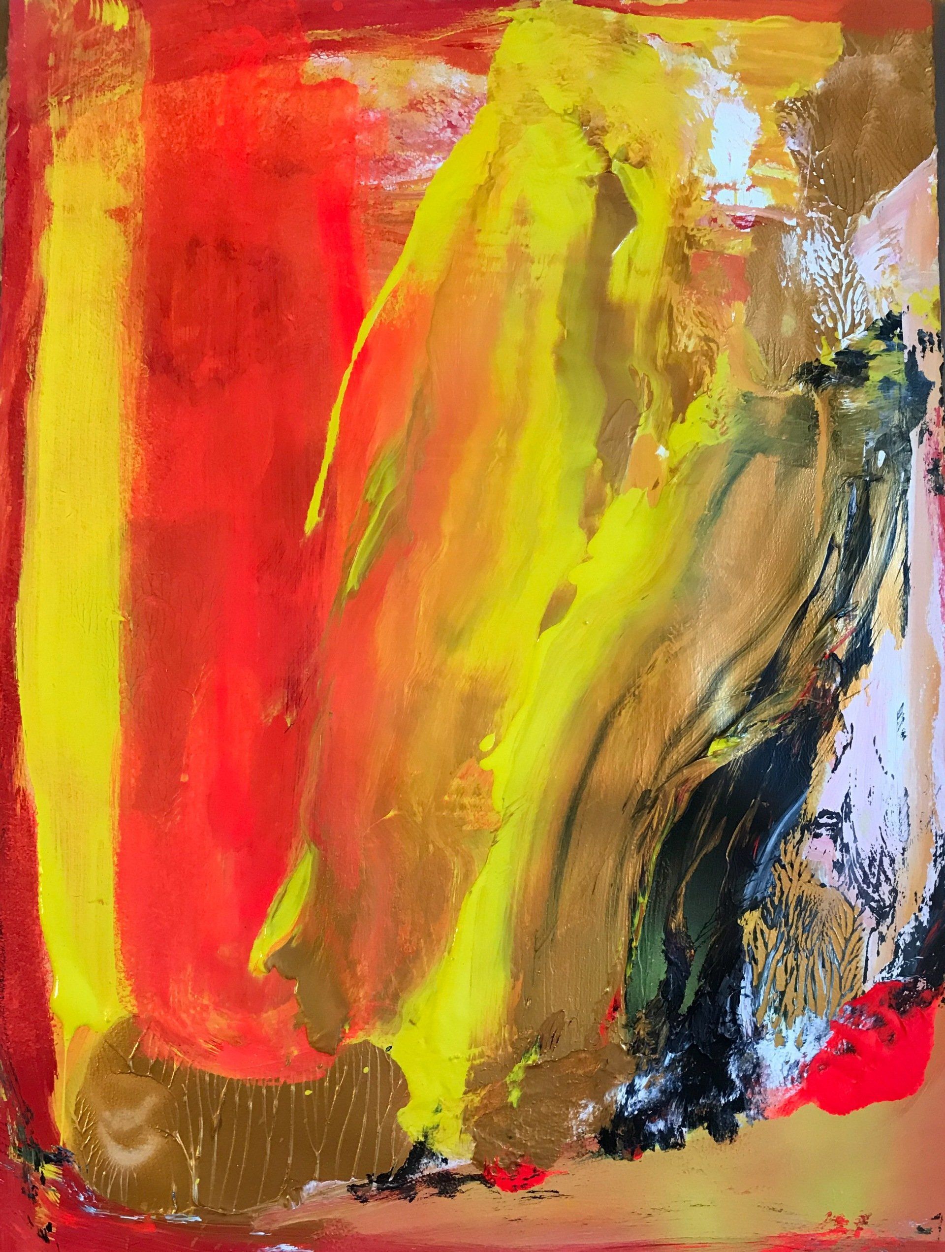 Her recent works now keep the 'subject' at a distance preferring her work to be simpler and purer in the sense of it being non-referential, a bold display of colours to record her fleeting experiences, often abstract and always spontaneous and uncompromising. She mainly uses acrylic paint which is kinder to the planet by using fewer chemicals and also enjoys the speed in drying time, being able to over paint rapidly. "I feel liberated by my somewhat explosive, sometimes risky, painting style but there still has to be a balance, no matter how daring, there has to be a sense of space, colour and shape; there still has to be discipline and structure and this does not happen by chance but by hard work".